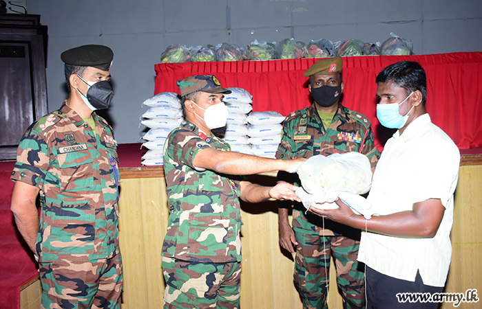 A total of 100 dry ration packs, patronized by an expatriate in the US were distributed among flood-affected low income group families in the general areas of Kilinochchi by 1 Corps at Kilinochchi on Wednesday (17) after inviting the victims to the Nelum Piyasa auditorium at Kilinochchi.