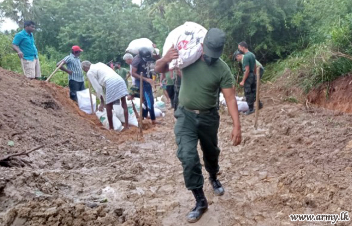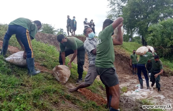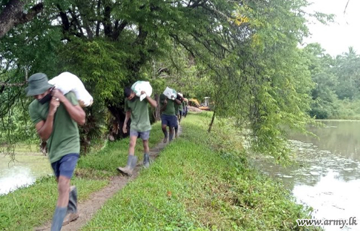 Troops accordingly with the support of farmers and villagers in the area stacked sandbags on the affected bund with the supply of sand and sachets, needed for renovation by the Divisional Secretariat for Nikaweratiya.