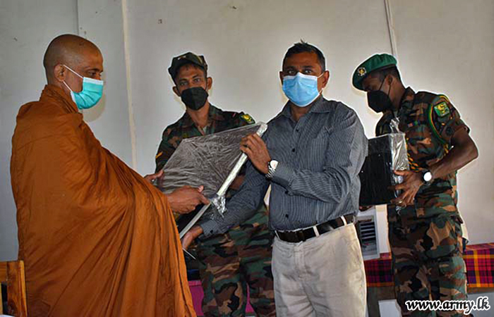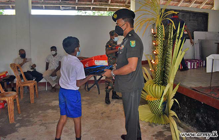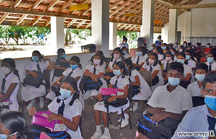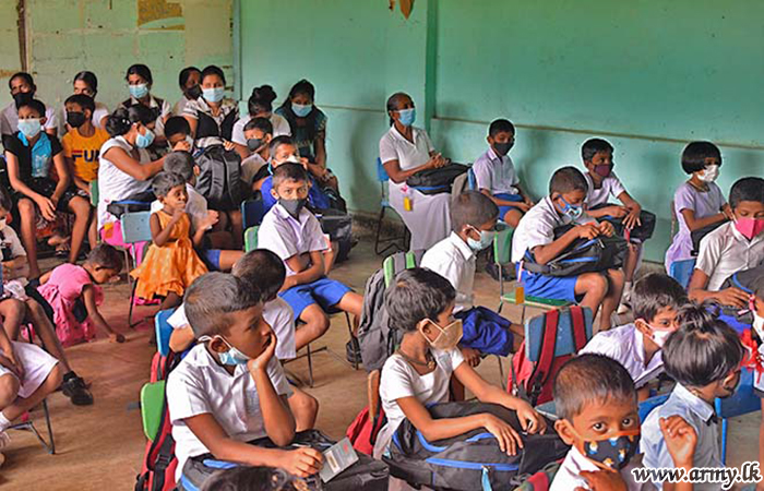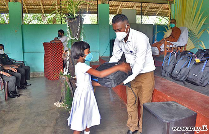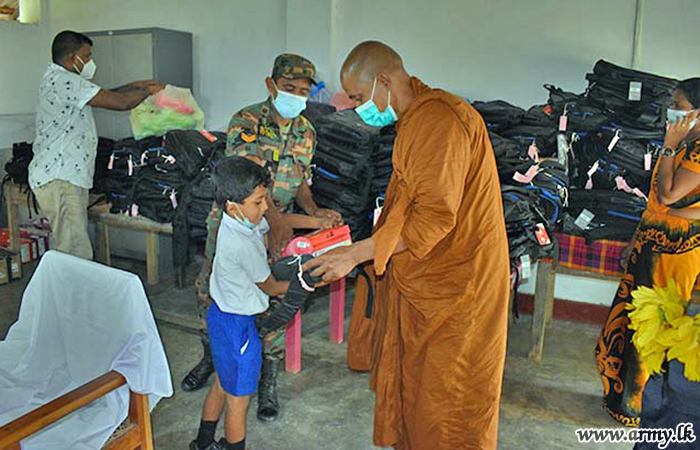 9 Gajaba Regiment (GR) troops of the 623 Brigade under the 62 Division of the Security Force HQ-Wanni with the objective of assisting continuation of studies of students and raising educational standards at Gemunupura Primary School in Welioya, thanks to the sponsorship provided by one Ven Anuruddha Thero from the South coordinated the distribution of school books and stationery packs to some 35 low-income group students, each worth about Rs 6000/= on 14 November 2021.