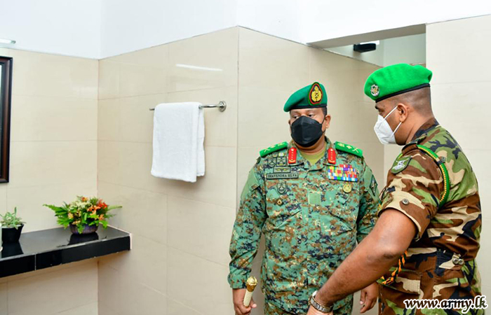 The Army Chief on arrival at the premises was welcomed by Major General Channa Weerasuriya, Commander, Security Forces - East together with the Major General Sanath Aluwihare, General Officer Commanding, 22 Division, Brigadier Dinesh Udugama, Centre Commandant Gajaba Regiment, Lieutenant Colonel A.K.M.U.K Navaratne, Commanding Officer of 2 (V) Gajaba Regiment, before the day’s Chief Guest was invited to unveil the plaque and cut the ribbon, amidst ‘Seth Pirith’, to declare the premises, now opened for both Officers and Other Ranks. General Shavendra Silva afterwards shared few thoughts with Army constructors present there and closely watched its interior facilities in the company of Commander Security Forces - East, General Officer Commanding, 22 Division, Centre Commandant, RHQ GR and Officers.