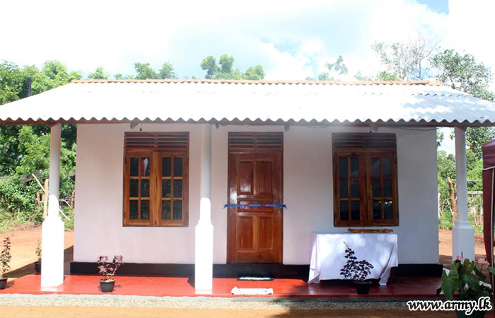 Hambantota-based 12 Division troops of the Security Force HQ - Central adding their weight to the Army’s ongoing house construction project for needy civilians put up one more new house for Mr P.S Wasantha in Gothameegama in Kataragama considering his miserable plight with family members with the support of a retired Army Officer.