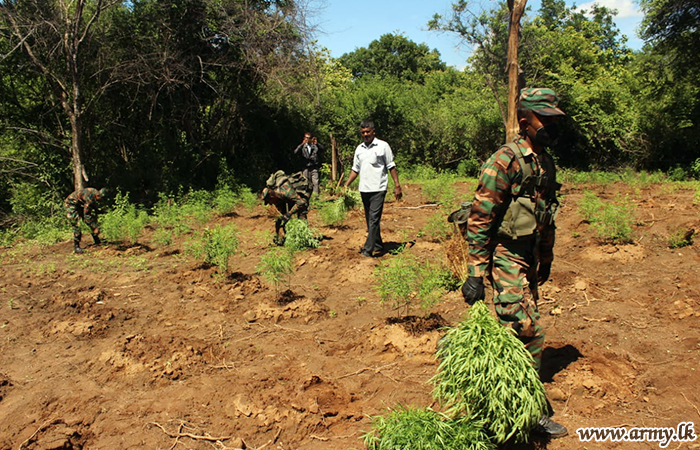 20 Sri Lanka Sinha Regiment troops (SLSR) of the 121 Brigade under the 12 Division on Thursday (2) during a foot patrol in the general area of Telulla, Ethiliwewa raided two plots of cannabis (Ganja) cultivations and found more than 2500 saplings of different sizes.