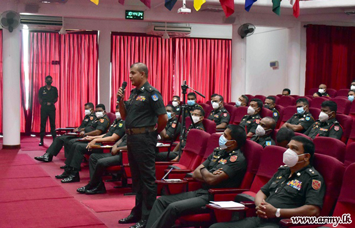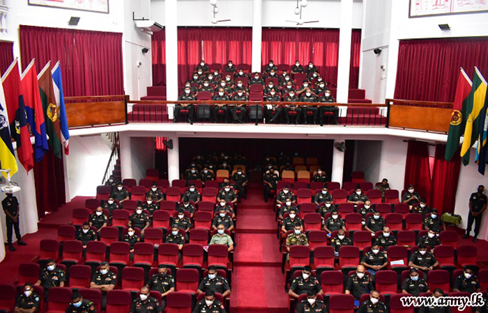 Ninety-Eight Student Officers of Junior Command Course No-22 and Senior Command Course No-22 with instructors listened to a lecture, delivered by Major General Harendra Ranasinghe, Commander of 1 Corps at the Officer Career Development Center (OCDC) Buttala on 29 November on the topic "Leadership Challenges and Commander Experiences in 2021".