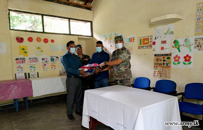 Troops of the 17 (V) Sri Lanka National Guard of the 221 Brigade under the 22 Division with sponsorship provided by Vice Chairman, Mirigama - Pradeshiya Sabha donated school accessories for students learning at Sagarapura Primary School, Jayanagar in Trincomalee District on Friday (17).