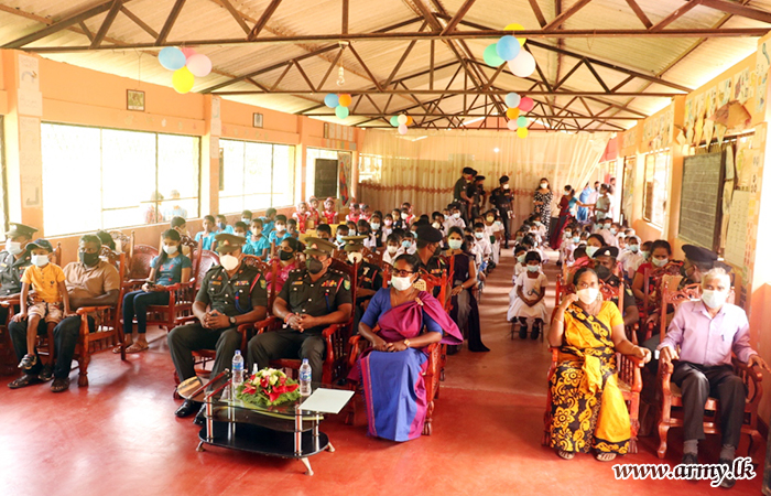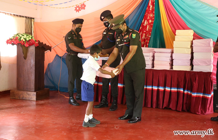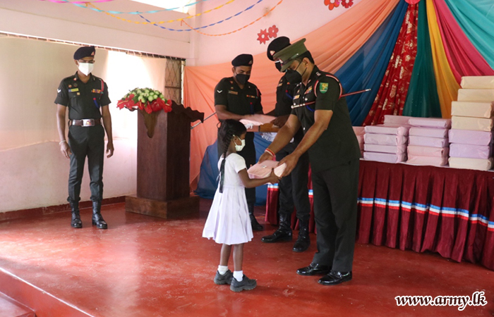 The community assistance programme that corresponds to the Commander's 'Army Way Forward Strategy 2020-2025' was meant to help uplift educational standards of students in this remote area where economic hardships pose a barrier to their studies. The Commander 213 Brigade, Colonel L.G.J.N Ariyathilaka with the support of the Commanding Officer 5 (V) Battalion Sri Lanka Light Infantry, Major S.D Ratnasiri launched the project inviting those children with parents to the school premises.