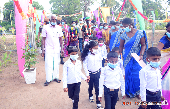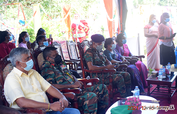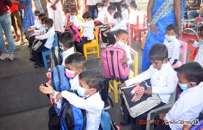 Kids learning in the Sugandhipuram colony Pre School on Christmas day (25) received free packs of school books and accessories, thanks to the coordination of the 681 Brigade of the 68 Division under the Security Force Headquarters - Mullaittivu.