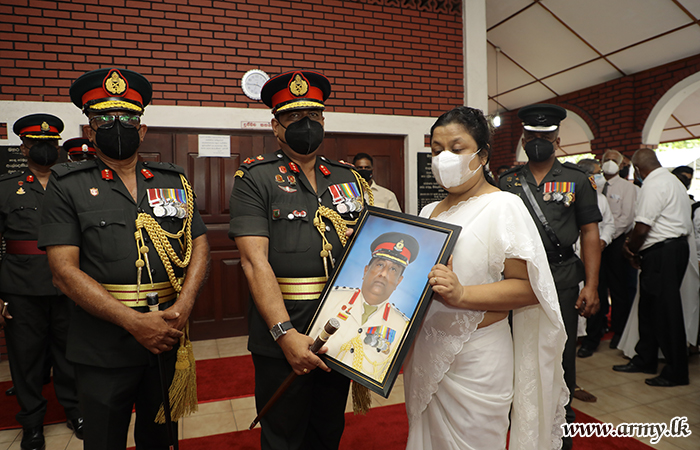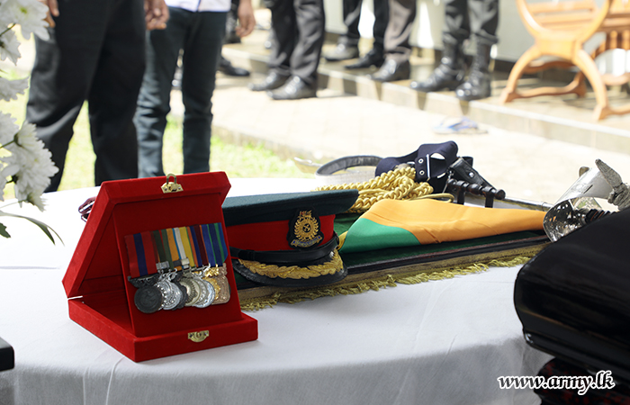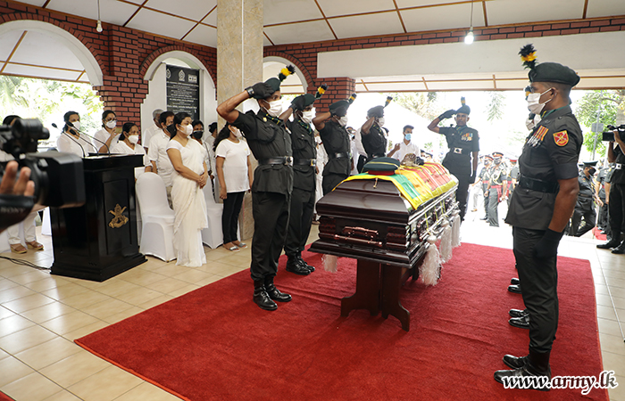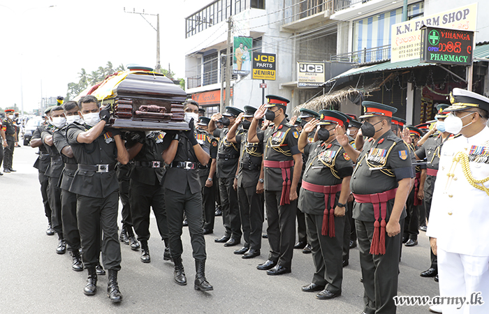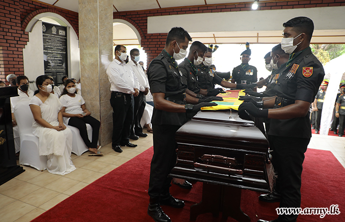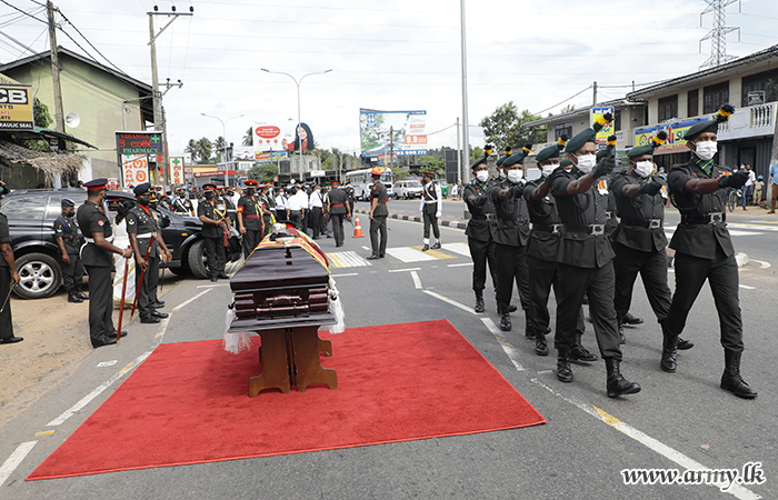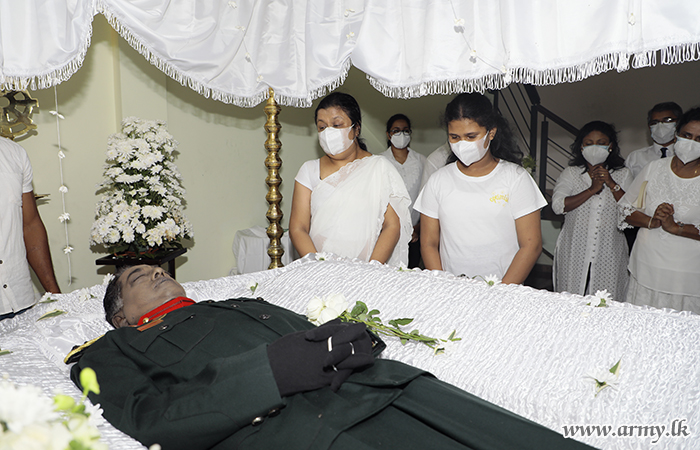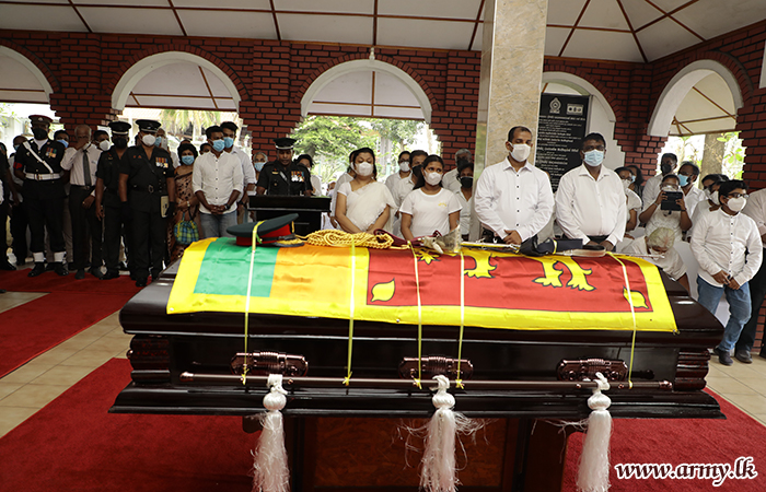 At the cemetery, a restricted number of Officers and Other Ranks, including the Adjutant General, Major General Deepal Pussella, who represented the Commander of the Army at the cemetery, Colonel of the Regiment, Sri Lanka Sinha Regiment and Commander, Security Forces - West, Major General Kithsiri Liyanage were present at the military funeral.