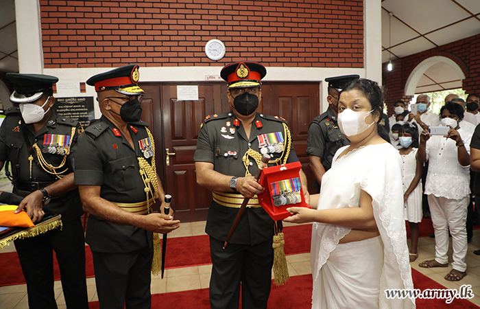 Seconds after that, Major General Deepal Pussella together with Major General Kithsiri Liyanage presented the bereaved family with the decorations and medals Brigadier Panduka Perera had earned during his illustrious career, a general tradition, practice in the armed forces.