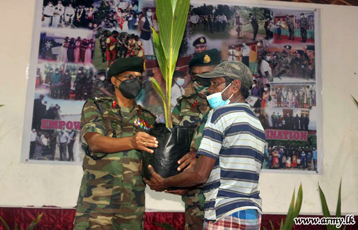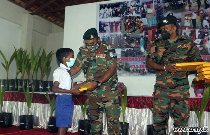 During the full-day project, Brigadier Nishantha Muthumala, Commander, 572 Brigade with his troops meanwhile pocketed out their own money and donated school accessories to 100 deserving students. At the same occasion, 50 coconut saplings were also given away to the civilians in the area in order to encourage them for cultivation of coconut saplings.