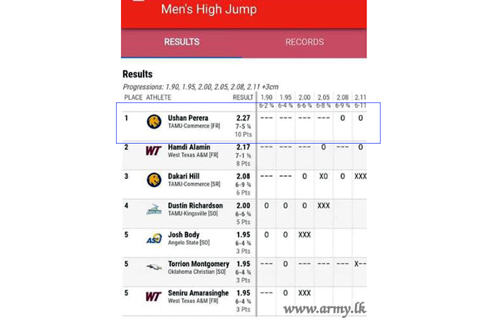 Private H. T. U. T Perera of the Sri Lanka Army Service Corps (SLASC) participating in the Indoor High Jump event at the Indoor Lone Star Conference (LSC) competition at Texas Tech Sports Performance Center in Lubbock, Texas in the US broke his own record and renewed it making a new achievement during 25 -26 February.