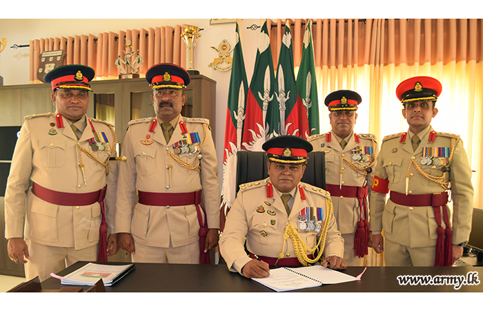 The newly-appointed General Officer Commanding of the 52 Division was warmly welcomed by the Staff Officers of the Division Headquarters before he was greeted to a Guard Turnout by troops of the 15 (V) Gajaba Regiment. Afterwards, Brigadier Udaya Herath in his new office signed an official document signifying the acceptance of his new office and sat for a group photograph.