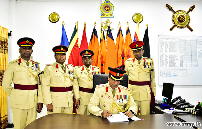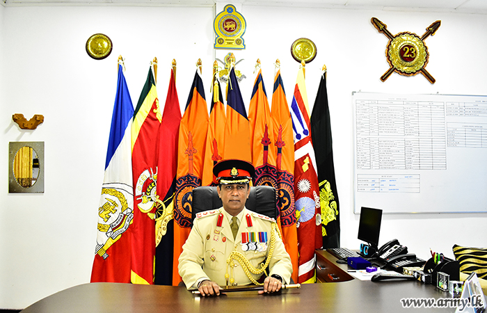 The newly-appointed General Officer Commanding of the 23 Division was warmly welcomed by Staff Officers and saluted in a Guard Turnout, presented by 6 Gajaba Regiment troops as he entered the premises.