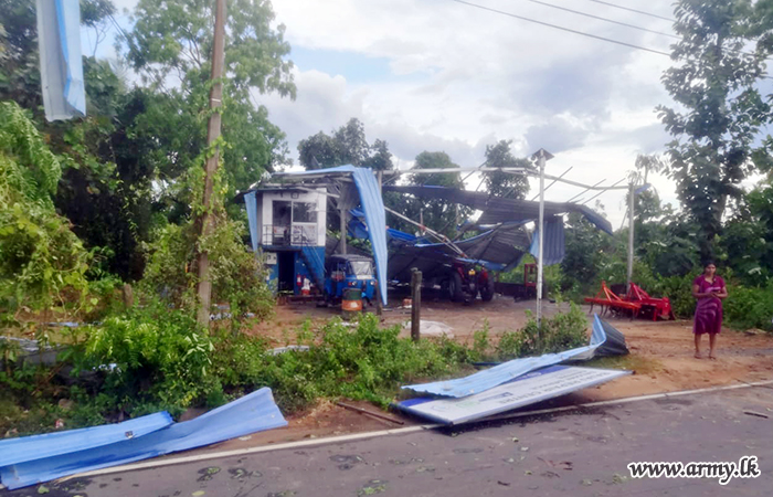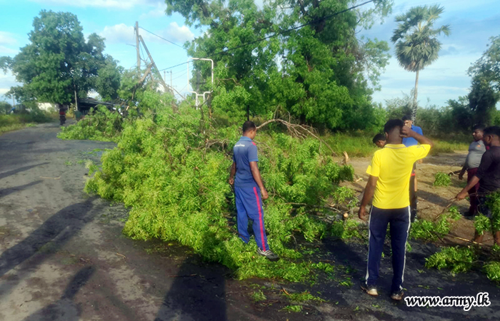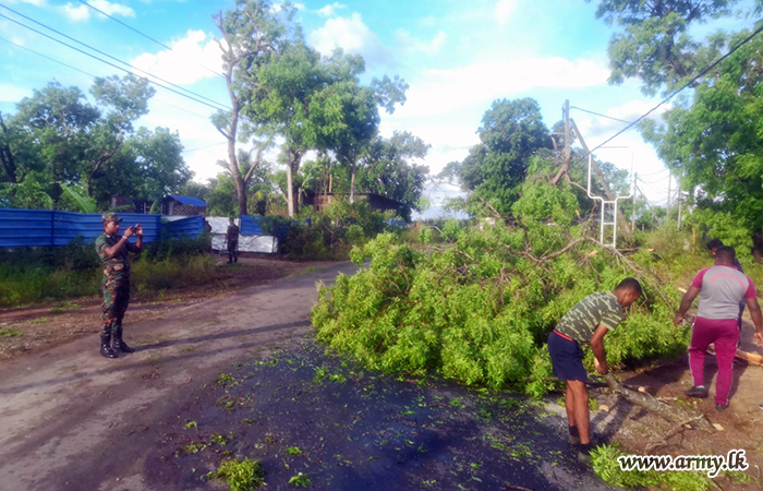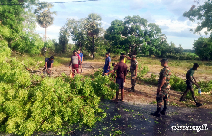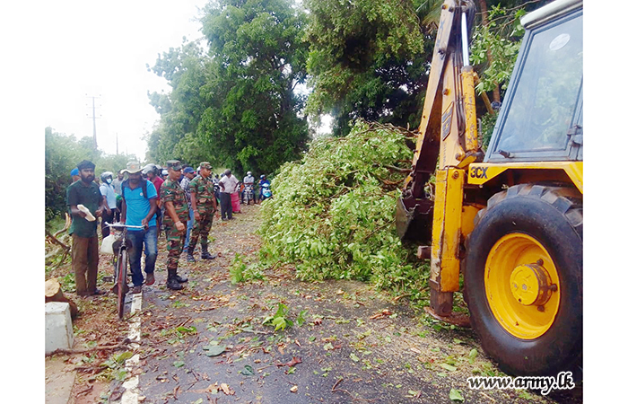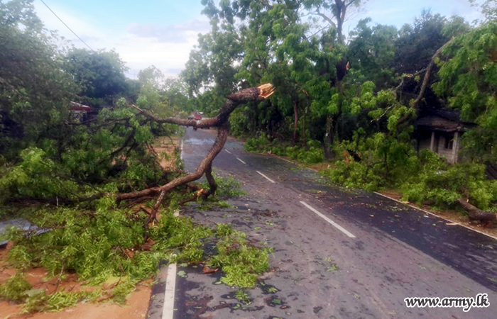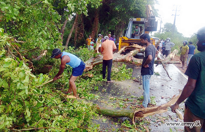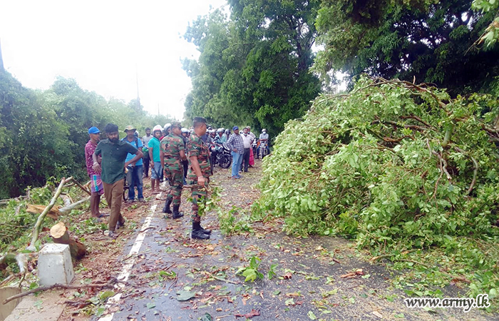 Troops of 16 Sri Lanka National Guards (SLNG) under command to the 241 Brigade of the 24 Division of the Security Force HQ - East (SFHQ-E) this afternoon (24) rushed to clear the road patch between Kalmunai and Uhana, Malwatte after torrential rains and thunderstorms made trees to fall along the road.