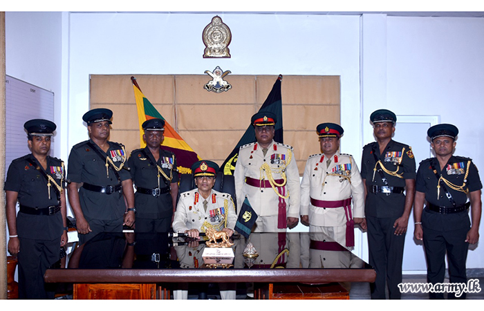 Later, Major General Priyantha Jayawardena in his new office placed his signature in a formal document symbolizing the assumption of duties as the Colonel of the Regiment.
