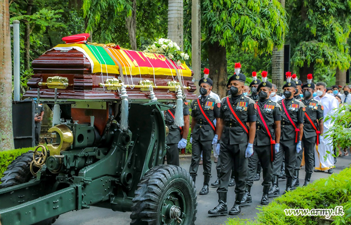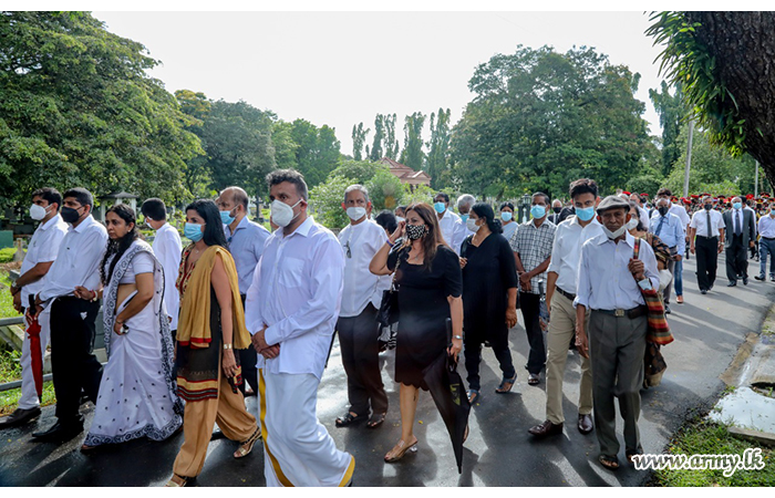 Troops in accordance with military traditions received the remains, presenting arms near the entrance to the cemetery before being placed in the gun carriage and draped it in the National flag. As the funeral procession reached the main entrance to the cemetery, a representative gathering of senior officers formally, received the coffin and began to inch their way towards the crematorium after all of them together with family members lined up behind the coffin.
