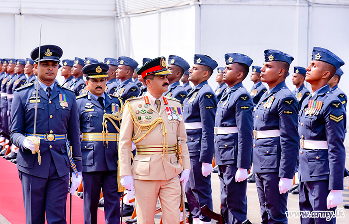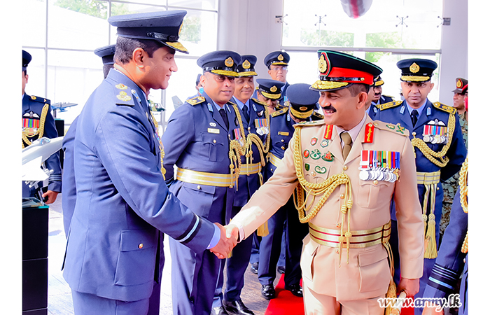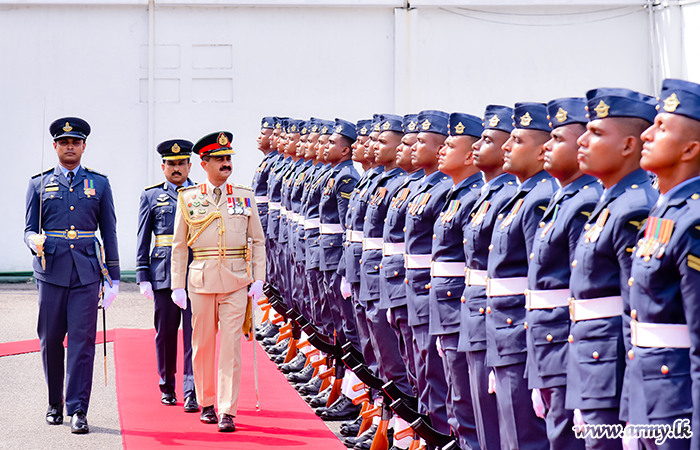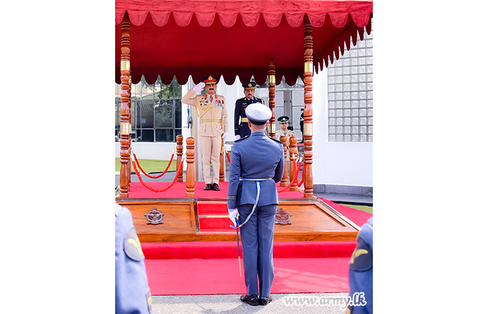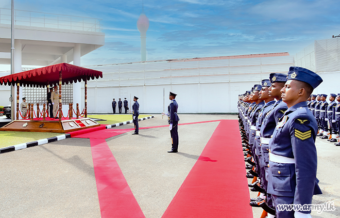 Air Vice Marshal Dilshan Wasage, Commanding Officer, Sri Lanka Air Force Base, Colombo welcomed Lieutenant General Vikum Liyanage on arrival at the Air Force Headquarters and invited him to receive the salute in the Guard of Honour, accorded in his honour in conformity with military traditions. Lieutenant General Vikum Liyanage at the Parade Commander’s request took the salute after review of it from the special dais.