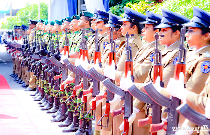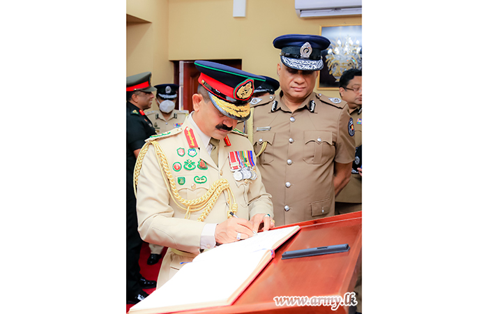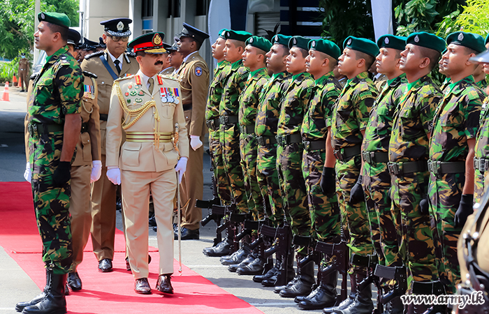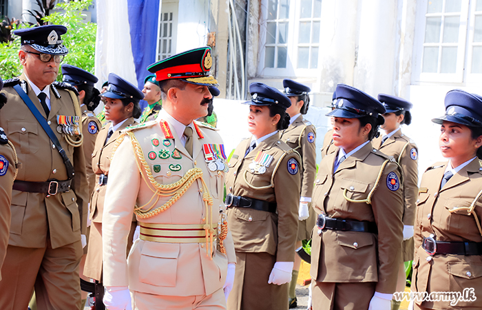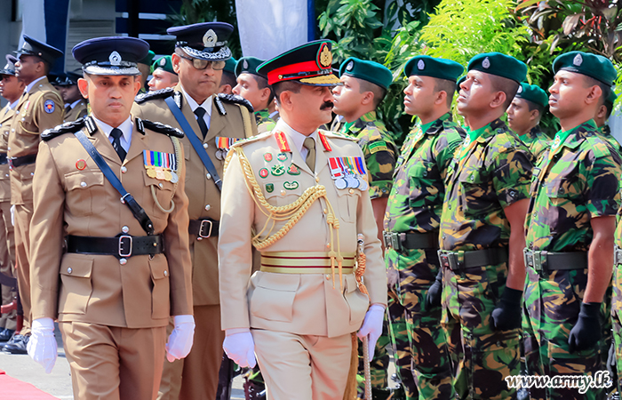 A Guard of Honour, presented by a combined team of Police and STF officers with Police women at the Police Headquarters saluted Lieutenant General Vikum Liyanage, Commander of the Army when he made his first courtesy visit to the Police Headquarters this morning (10) after assumption of his new office at the Army Headquarters.