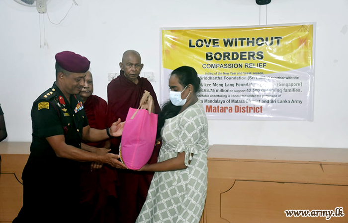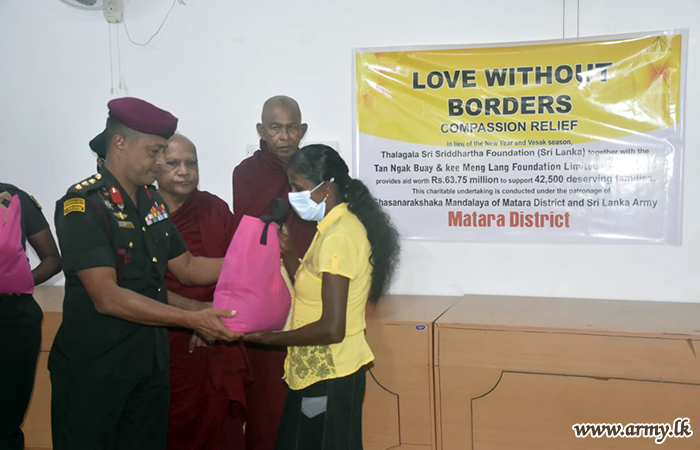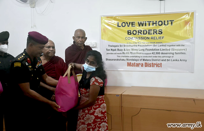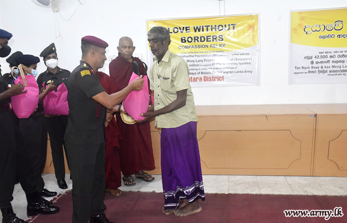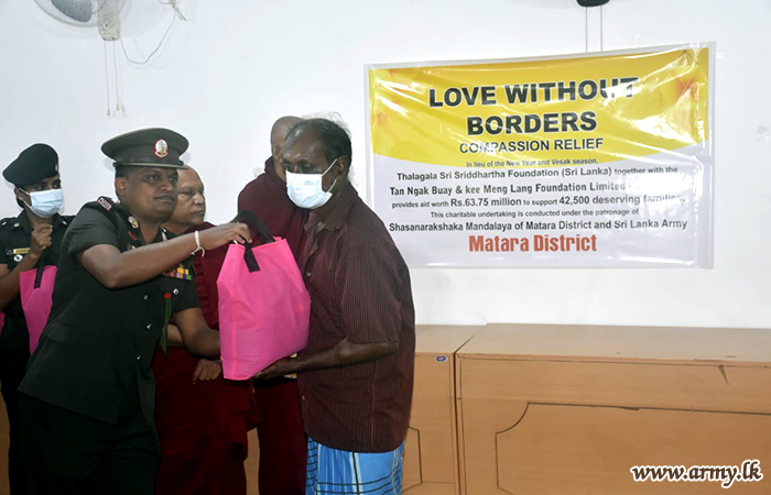 Ven Talagala Sumanaratana Nayake Thero’s Talagala Sri Siddhartha Foundation and Tan Nagak & Kee Meng Leng Foundation Limited (Singapore), very active in the supply of relief dry ration packs among low-income group families across the country in the past couple of months extended their joint helping hand to the deserving in Matara district at the invitation of the Army.