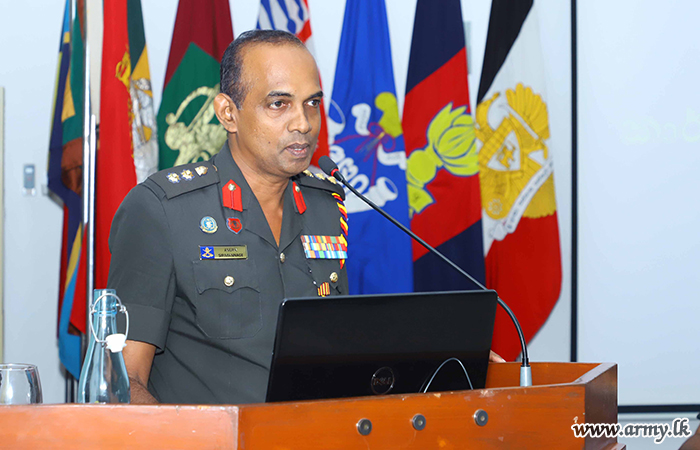 The first session of the day was conducted by Brigadier J.A.R.S.K Jayasekara, Director, Directorate of Electrical and Mechanical Engineers who shared his knowledge and experiences on present and future economic challenges in the country, crisis management, how to change attitudes of Army personnel over the crisis, Logisticians’ responsibility during the crisis and how to achieve plans thru SWOT analysis.