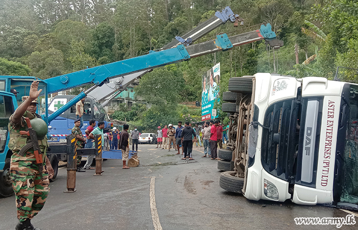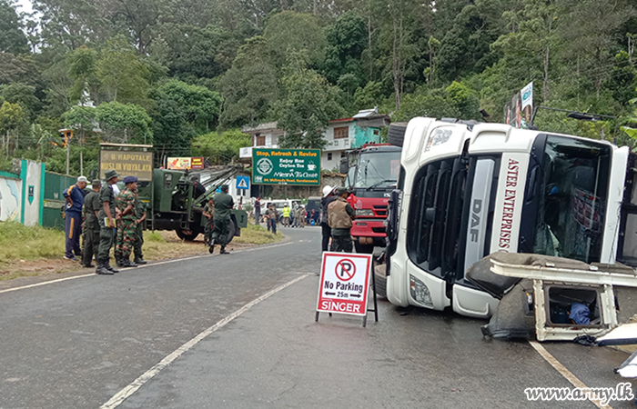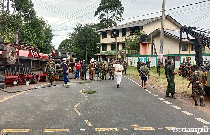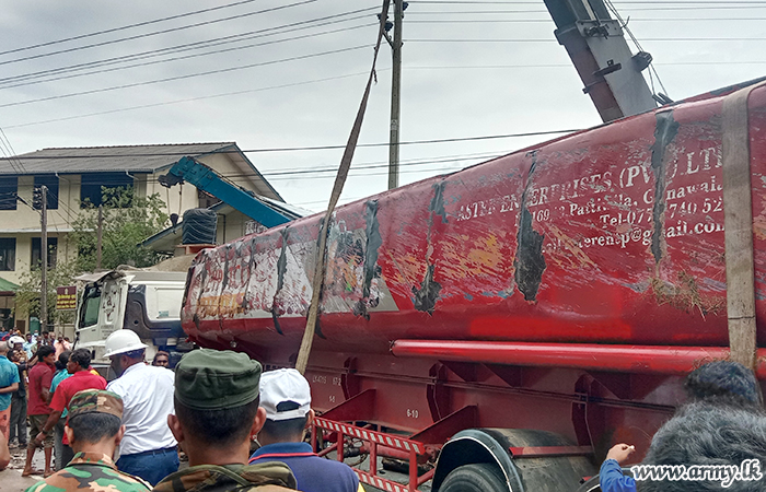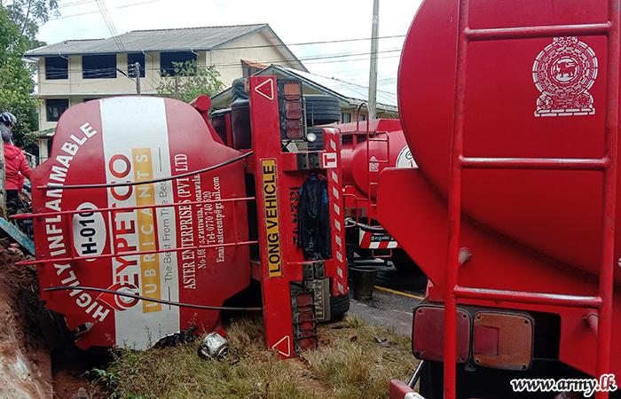 Troops of the 2 (Volunteer) Sri Lanka Electrical and Mechanical Engineering (SLEME) serving under the Security Force Headquarters - Central quickly responded and assisted the removal of a fuel bowser that slipped off the road and toppled near the Muslim College in Haputale around 6.30 am on Monday (11).