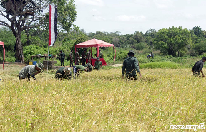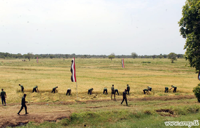6 Sri Lanka Armourd Corps (SLAC) troops of the 223 Brigade under the 22 Division of the Security Force Headquarters - East (SFHQ-E) who using organic fertilizer sowed 1.5 acre patch of abandoned paddy fields in Mailawewa area some three months ago succeeded in reaping a harvest of 1750 kg of paddy during a simple ceremony on Saturday (16).
