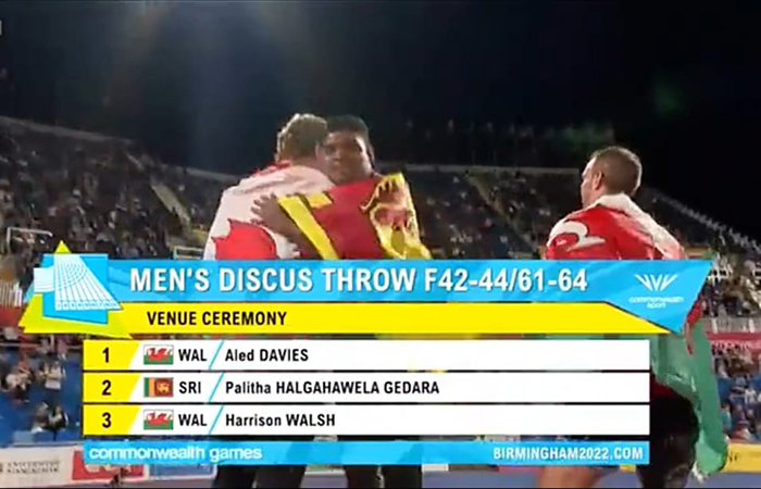 The Para Athlete, Corporal Palitha Bandara of Sri Lanka Army National Guard (SLNG) won the Silver medal in the Discus Throw F42-44/61-64 category recording a distance of 44.20 m in the Commonwealth Games - 2022, now on in Birmingham, England.