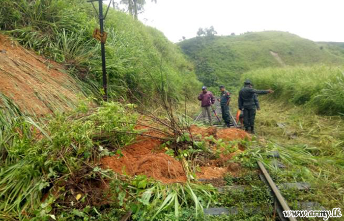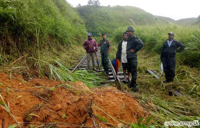 Troops of the 19 Sri Lanka National Guard as per guidelines given by Major General Samantha Silva, Commander, Security Forces - Central and the General Officer Commanding, 11 Division carried out the emergency work under the close supervision of the 112 Brigade Commander and 19 SLNG Commanding Officer. A two digit number of troops including an Officer contributed to the emergency removal of those soild mounds, enabling trains to resume operations.