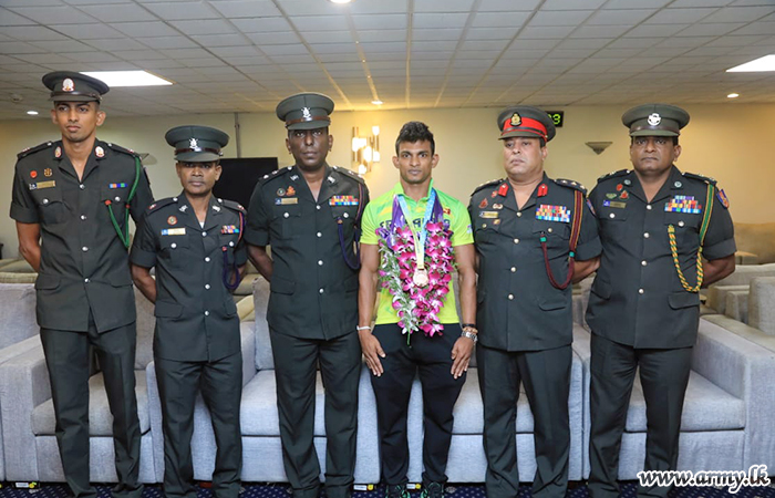 On arrival at Bandaranike International Airport port, he was warmly welcomed by the Director General Sports of the Ministry of Sports and Youth, Colonel Srinath Gallage, Colonel Sports of the Directorate of Sports, Lieutenant Colonel Buddika Jayasuriya, Staff Officer I Sports - Directorate of Sports, Lieutenant Colonel Manjula Subasinghe, Secretary of the Army’s Weight Lifting and Power lifting Committee, Mr H.P.A.R Bandara, the Chairman Sri Lanka weight lifting federation, National Coach. Mr R.B Wickramasinghe, Director General of the Sports Ministry, Mr Amal Edirisooriya and several others including the medalists relatives.