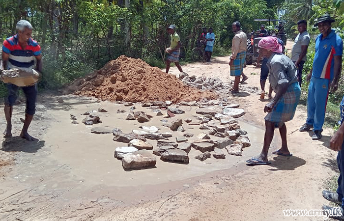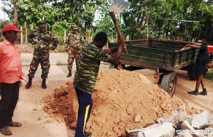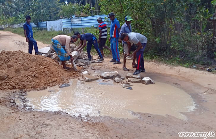 Troops of the 9 Sri Lanka National Guard (SLNG) of the 681 Brigade of the 68 Division under the Security Force HQ Mullaittivu offered their assistance to Road Development Authority workers for the repair of the road patch between Sugandhipuram and Udayar Kattu school on Tuesday (9) after an initiative to this effect was taken by the Army.