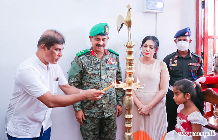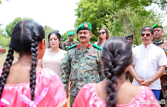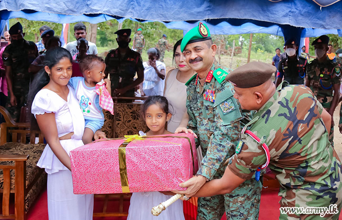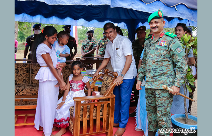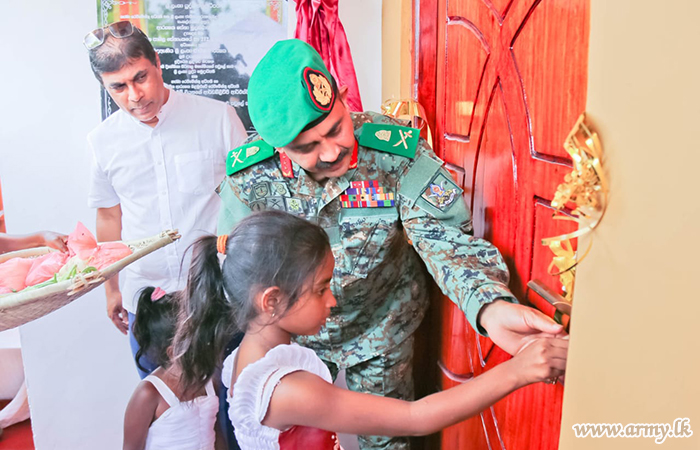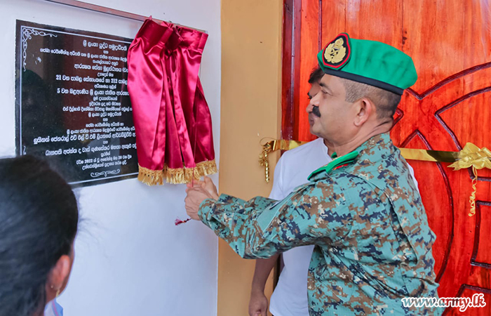 General Officer Commanding, 21 Division and Commanding Officer of the 5 SLNG warmly welcomed Lieutenant General Vikum Liyanage to the location on arrival and the day's Chief Guest amidst ‘Seth Pirith’ chanted by members of the Maha Sangha handed over the key of the Army-erected new home to the beneficiary.