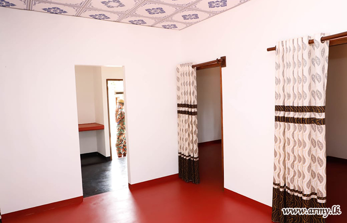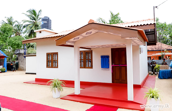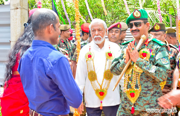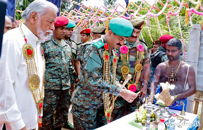The inaugural warming of the Army-erected new house with funds, released to the Army by the peninsula-based donor, Mr Vish Nataraja took place Friday (26) noon during a brief ceremony of Hindu rites and rituals where the Army Chief at the invitation of the Commander, SF-J graced the brief ceremony as the Chief Guest to hand over keys to the recipients. Troops of the 16 Sri Lanka Light Infantry of the 551 Brigade under the 55 Division volunteered, offering technical, engineering and manpower assistance for the construction of it within a short span of time.