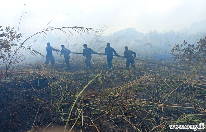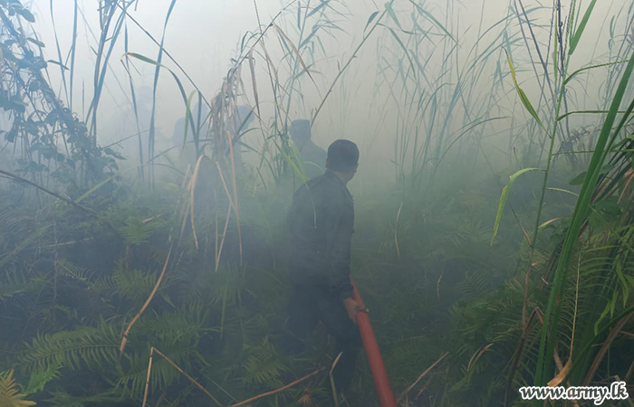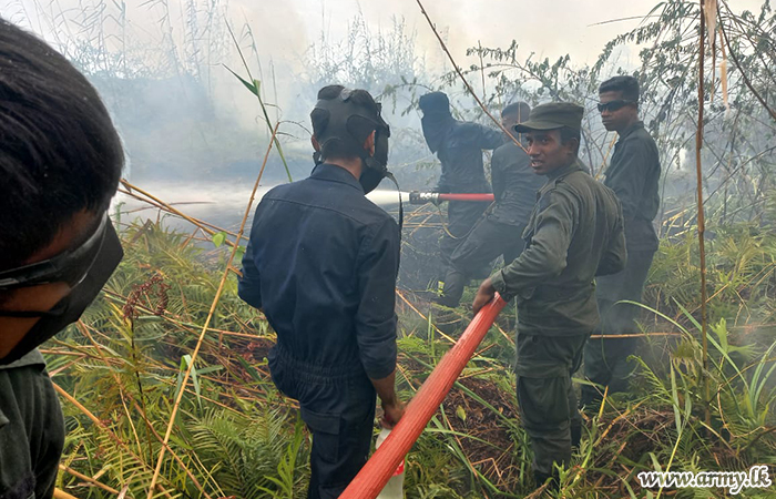 A contingent of Army personnel belonging to the 8 Battalion Sri Lanka Light Infantry of the 141 Brigade of the 14 Division under the Security Force HQ - West early morning on Friday (26) lent their active support to contain a fast-spreading bush-fire in Muthurajawela Wetlands Forest Reserve at general area of Pubudugama in the Wattala Divisional Secretariat in collaboration with the Navy, Disaster Management Centre at Gampaha and the Divisional Secretariat Wattala.