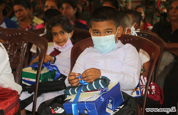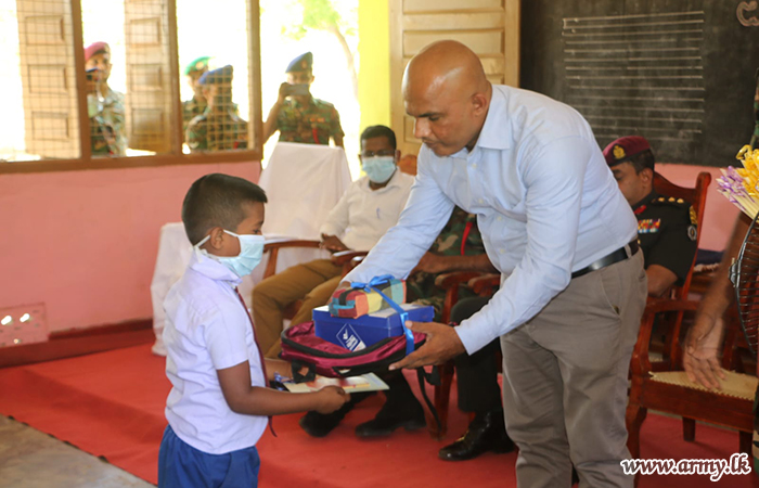 24 school-going children in the Dutugemunu primary school in Ampara on Tuesday (23) received a pack of essential school accessories, inclusive of school bags, pairs of shoes, stationery items and also a Bank account for each student which deposited Rs 750/= which will, in turn, assist them to continue their studies. Major Kusumsiri Liyanage (Retired) of the Soul Foundation and the People’s Bank of Ampara sponsored the project at Army’s request.