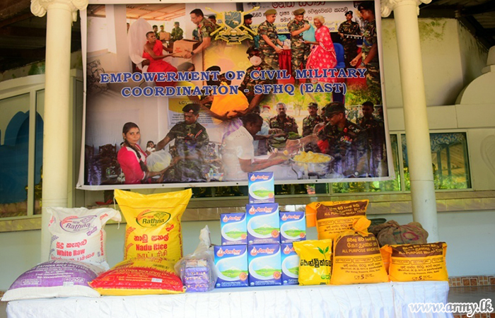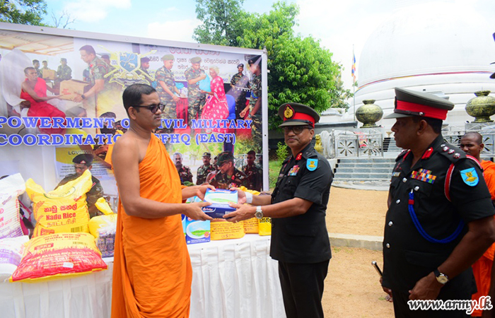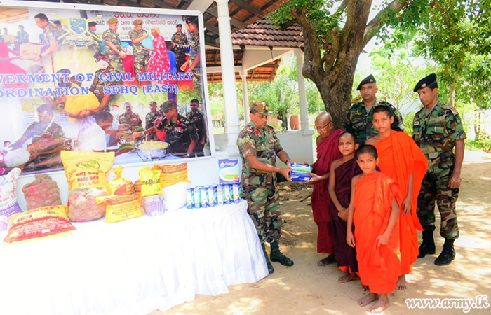 Troops of the of Security Force Headquarters - East (SFHQ-E) with patronage received from Mr. Kushil Gunasekara, the chief trustee of the ‘Foundation of Goodness’ took steps to provide free dry-ration packets to temples in remote areas of Kandakadu, Damminna, Sewanapitiya and Mahawewa areas on Monday (5).