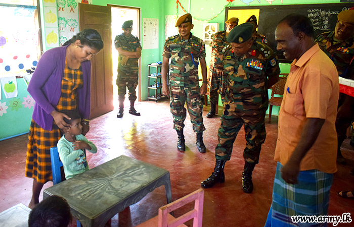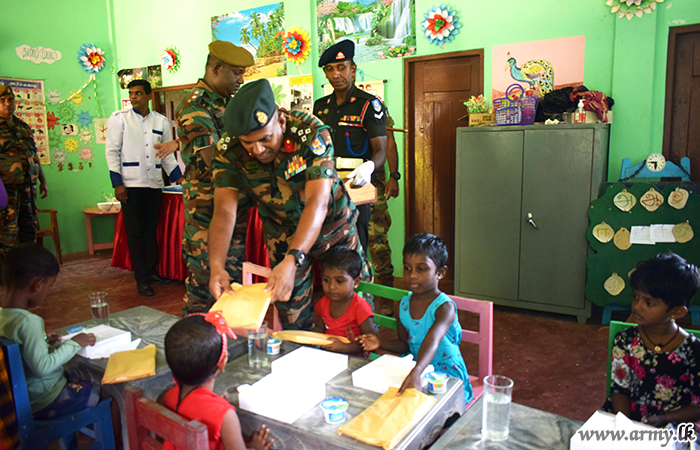 9 Sri Lanka National Guard (SLNG) troops under command to the 681 Brigade of the 68 Division under the Security Force HQ- Mullaittvu donated school aids and breakfast to 20 kids in Sugandhipram pre-school on Monday (5) as one more civil-military cooperation project of the 681 Brigade.