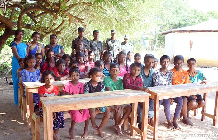 With the intention of uplifting the educational standards of the needy students in the Vallipunam area in Mullaittivu, 681 Brigade troops using locally available raw materials, made six desk tables and six benches that can be used to continue their after school studies in a tuition class, adjacent to the Sencholai playground.
