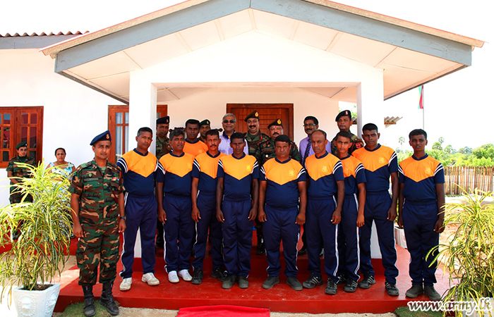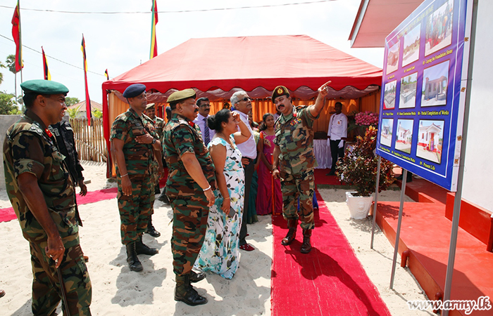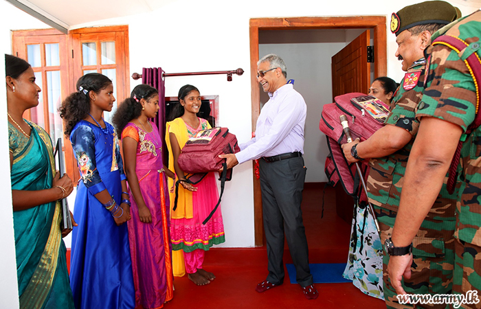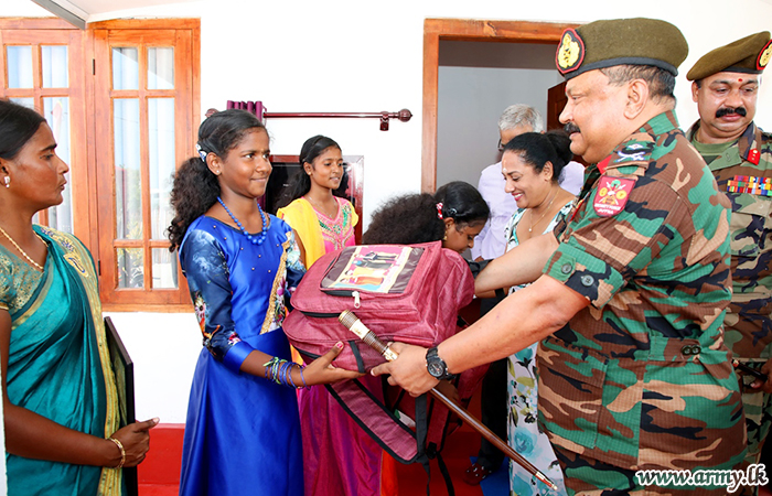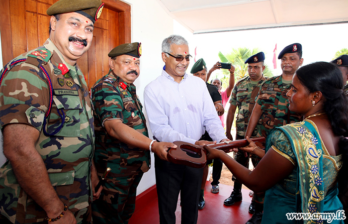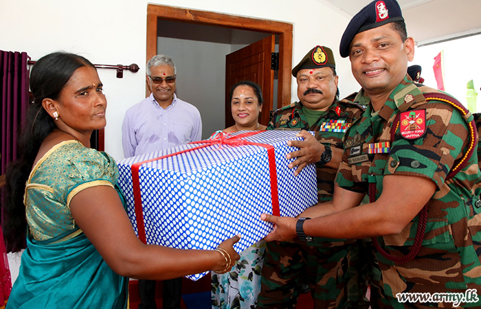After unveiling a plaque to that effect, the day's Chief Guest, Jaffna Commander handed over the keys of the new house to the beneficiaries after religious blessings were over in the presence of the donor of funds for the worthy cause. Simultaneously, the Jaffna Commander gifted household items and a pack of dry rations to the family as tokens of goodwill. In addition, school students in the family and those who were present at the ceremony from nearby areas were also awarded educational accessories and a stock of essential reading and exercise books as incentives for studies.
