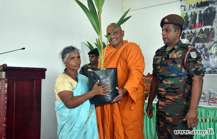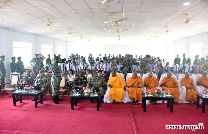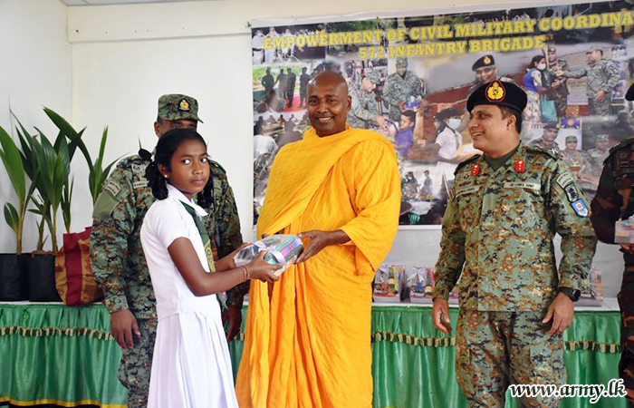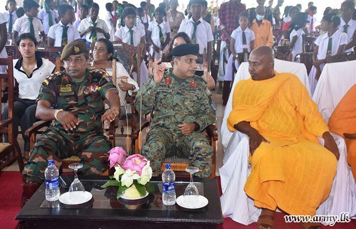 A multifaceted welfare project that got underway at Piramanthan Aru Vidyalaya, ‘Nethali Aru Vidyalaya, Punna Niravi Vidyalaya, and Vishwamadu Maha Vidyalaya on Friday (30) saw 57 Division troops of the Security Force HQ-Mullaittivu under the guidance of Major General Chandimal Peiris, General Officer Commanding, 57 Division and Major General Sanjaya Wanasinghe, Commander of the Security Forces-Mullaittivu gave away a large stock of school accessories, incentives and dry ration packs among students and civilians.