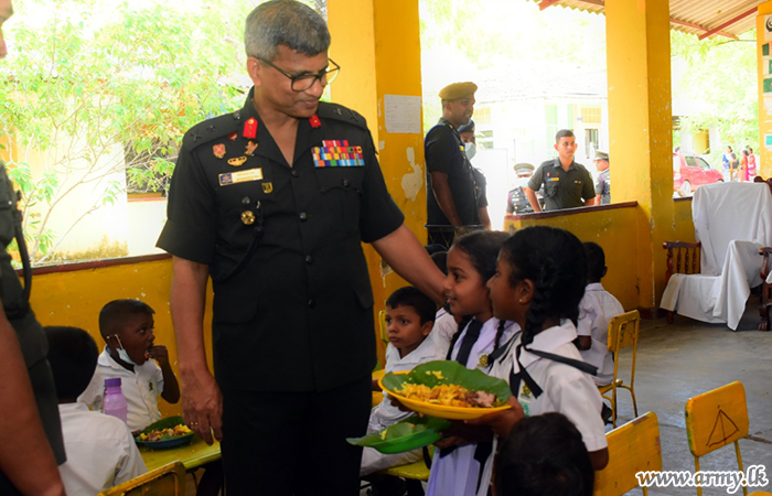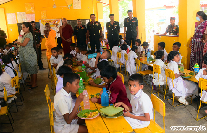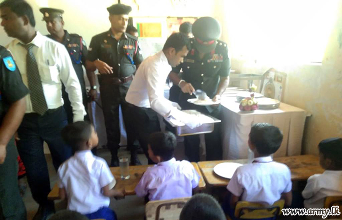 Students and Teachers of Polonnaruwa/Dimbulagala Kashshapa Vidyalaya, thanks to an initiative of the Security Force HQ - East, were the recipients of a lunch treat on Monday (03) with sponsorship extended by the Thalagala Sri Siddhartha Foundation of Ven Thalagala Sri Sumanaratana Nayake Thero at Thalagala, Horana. The events coincided with the Army Anniversary and the Children's Day.