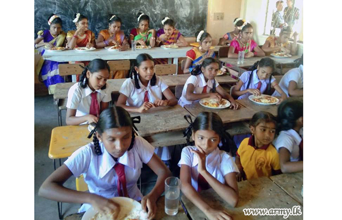 Under the guidelines and supervision of the Commander, Security Forces - East, 09 Battalion Sri Lanka Artillery Regiment, troops organized this Special Lunch at the above school premises. 550 Students and 32 teachers with staff took part in the lunch treat and expressed their thanks to the Army.