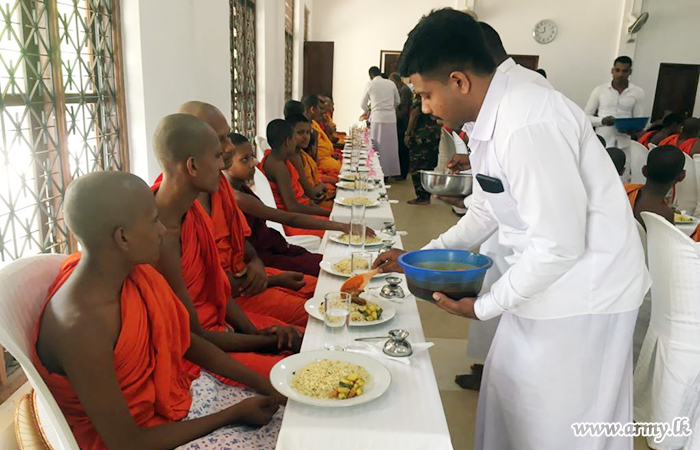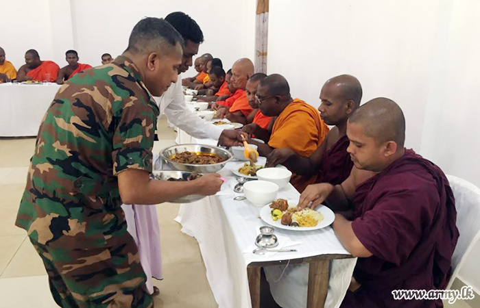 Troops of the 211 Brigade of the 21 Division under the Security Force HQ - Wanni on account of the 73rd Army anniversary offered ‘Saangika Daana’ (alms) to 100 Buddhist monks, resident in remote monasteries and temples in Medawachchiya and surrounding areas on Friday (7).