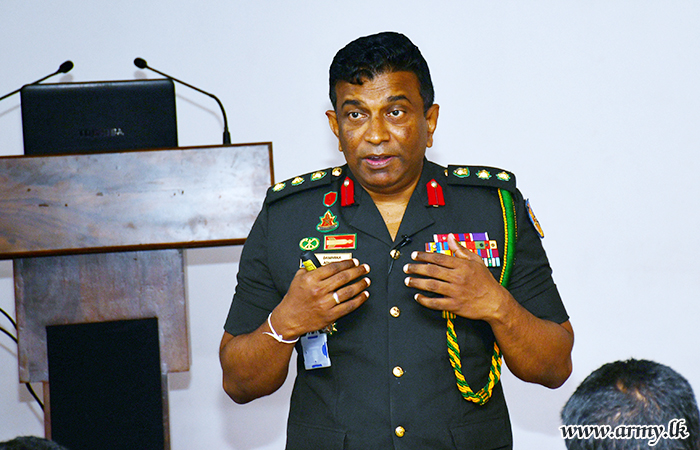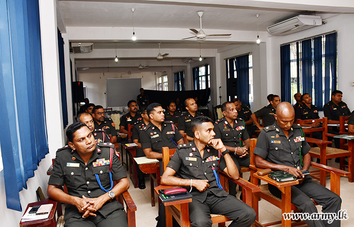A special lecture was delivered by Colonel Dhammika Adikari, Colonel Media at Directorate of Media, Army HQ to the course attendees of the Civil Affairs Officers’ Course No-21 at the Regimental Centre of the Corps of Engineer Services (CES) in Panagoda on Tuesday (18).