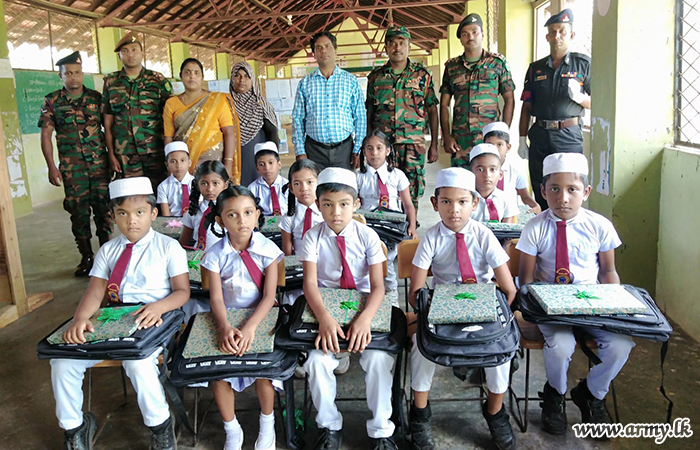 A gathering of 100 low-income group families in Iluppakadawai Government’s Tamil Mixed School, Anthonipuram Government’s Tamil Mixed School, Mundampiddy Government’s Tamil Mixed School, Koorai Government’s Tamil Mixed School, Kalliady Government’s Tamil Mixed School, Kovilkulam Government’s Tamil Mixed School, Aligar Muslim Vidyalaya and Joshep Vass Maha Vidyalaya in and around the general areas of Mannar were the recipients of school accessories and essentials, thanks to the generosity of Brigadier Dasantha Munasinghe, 541 Brigade Commander.