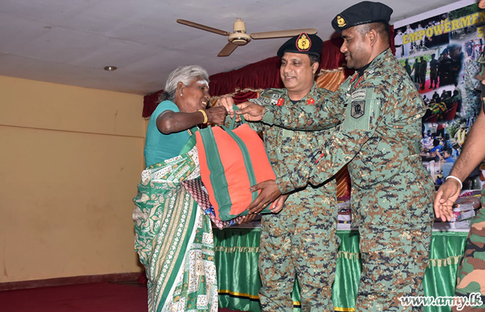 Major General Sanjaya Wanasinghe, Commander, Security Forces-Mullaittivu attending one more community project as the Chief Guest took steps to distribute free dry ration packs and school accessories among the worst-affected civilians and school students on Thursday (20) after inviting the beneficiaries to the Vishuamadu Maha Vidyalaya premises in Visuamadu, Kilinochchi.