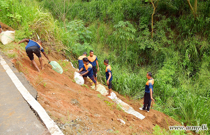 The affected road patch obstructed the movement of vehicles and threatened nearby houses, but the troops immediately patched up the affected section by placing sandbags before road authorities were informed of the road damage.