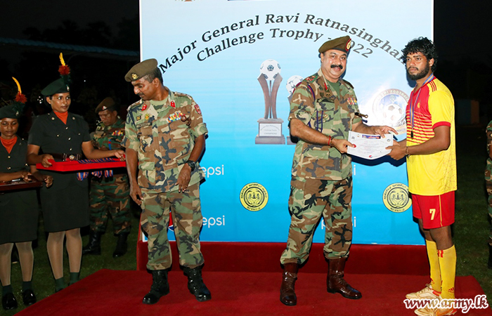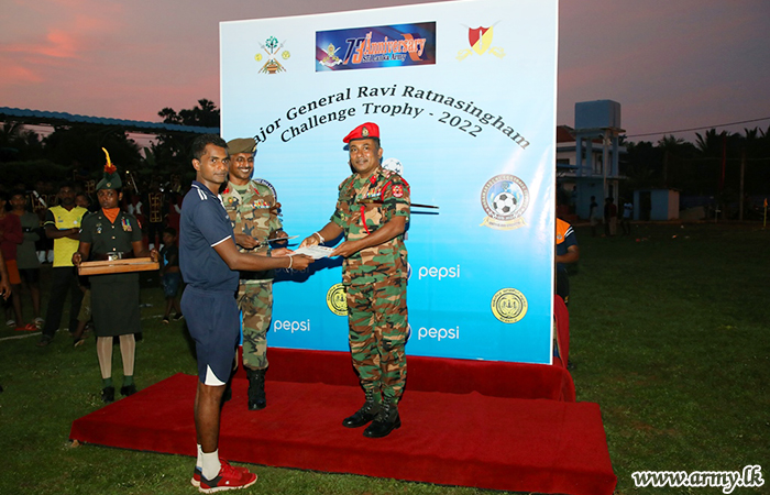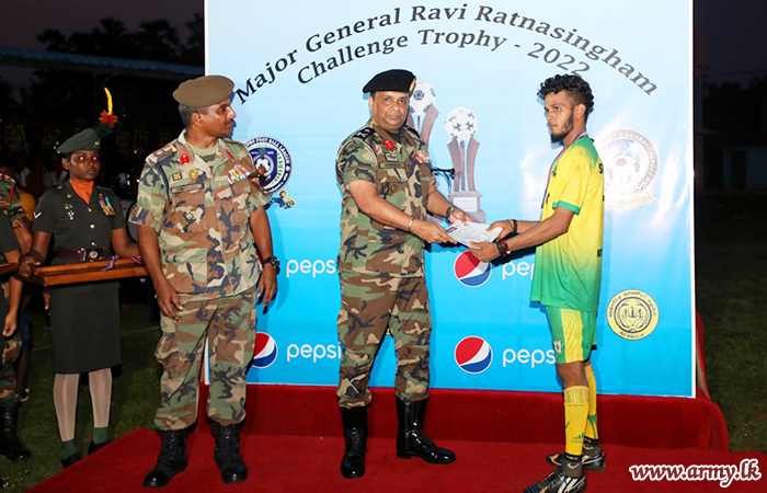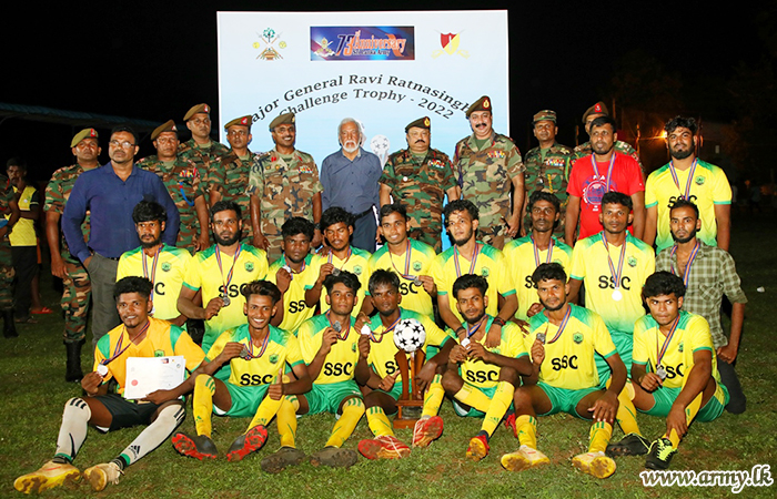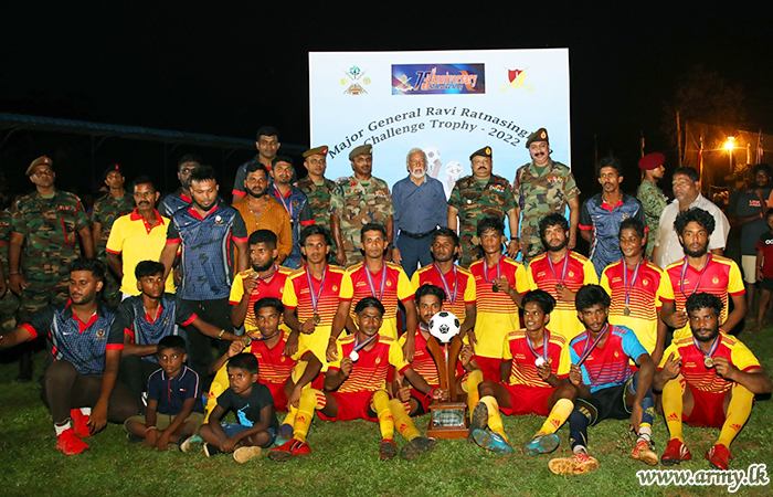 The tournament staged for 'Major General Ravi Ratnasingham Challenge Trophy -2022' plus a cash gift of Rs 100,000 was won by soccer players in the Jaffna-based Kalaimathi Sports Club during the finals.