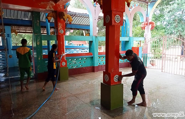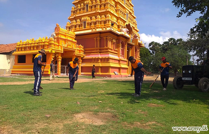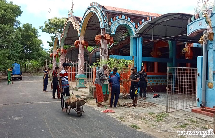 Troops during the project, carried out with the blessings of the Jaffna Commander, removed garbage in Kovil compounds and cleaned Kovil premises by re-arranging their land and pathways with sand, and made the locations neat and tidy before devotees flocked to those 69 temples for offerings.