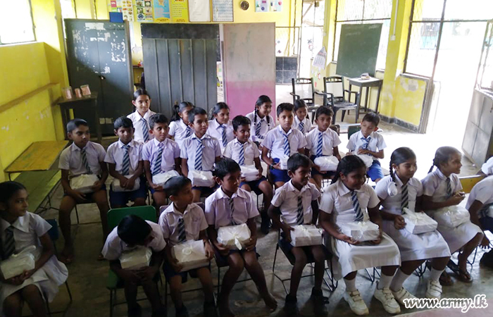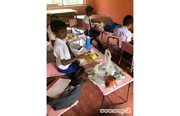 211 Brigade troops of the 21 Division HQ of the Security Force Headquarters - Wanni (SFHQ-W) with sponsorship received from Mr. Sunil Wijewardana, a well-known businessman in Kadawatha gave a lunch treat to 194 school students learning at four primary schools in Medawachchiya area.