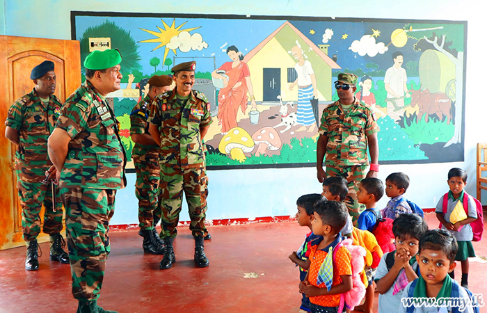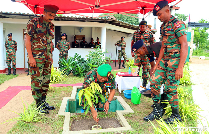 The General Officer Commanding 52 Division received a drive-pass welcome, presented by 11 SLE troops before the Commanding Officer, Lieutenant Colonel K. K. P. Pussewala and all the staff in the 11 SLE. During the visit, the General Officer Commanding planted a mango sapling to mark his first visit to the 11 SLE camp and addressed those troops, in which he explained his vision for the smooth conduct of affairs in the 52 Division's areas of responsibility. Afterwards, the General Officer Commanding had a field visit inside the 11 SLE detachment and also visited the Shanmuga Pre School premises in Pumpugar area.