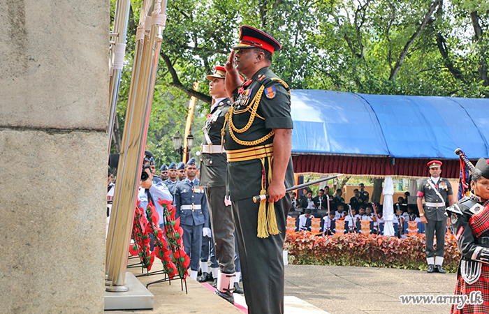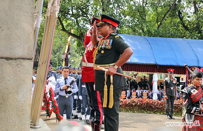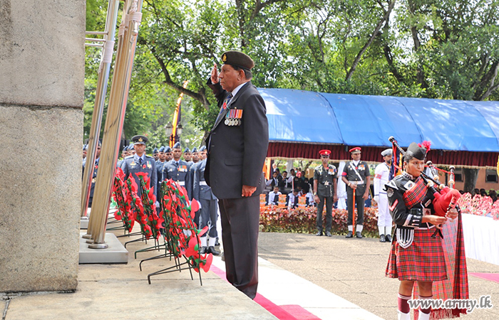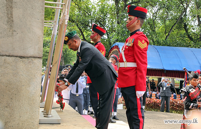 General G.D.H. Kamal Gunaratne (Retd) WWV RWP RSP USP ndc psc MPhil, Secretary to Ministry of Defence as the Chief Guest graced the event along with tri service representatives. Navy and Air Force Commanders and the Deputy Chief of the Army representing the Commander of the Army, along with a gathering of both serving and retired tri-service Officers and Other Ranks joined the day's remembrance.